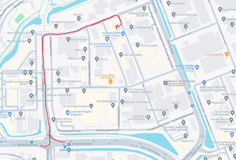 Vanaf Noord A16 Brienenoordbrug Ridderkerk aanhouden en dan ook bij de Rotterdamseweg stoplichten rechts.